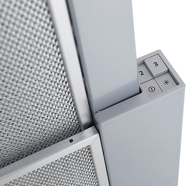 Управление — механическое, осуществляется кнопками. Монтаж осуществляется в кухонный шкаф, все необходимые крепления входят в комплект. Фильтры легко чистятся вручную или в посудомоечной машине.